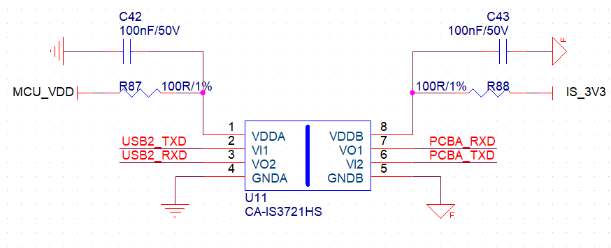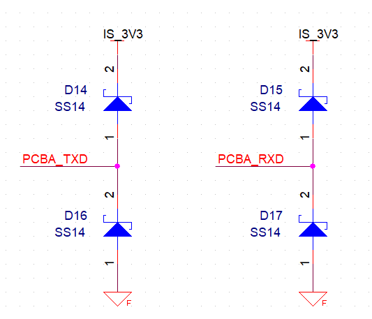 注意:一定要在对外的RX和TX加肖特基二极管进行保护,否则多次使用后还是会烧芯片(损坏四通道隔离芯片)