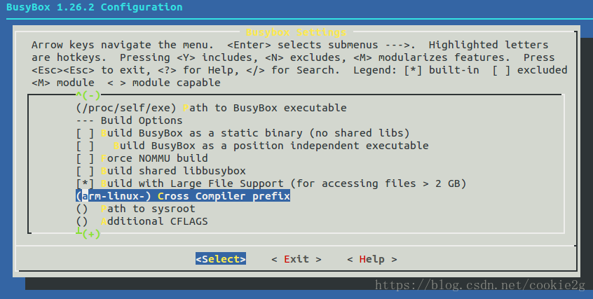 在busybox settings ----> build options ----> cross compiler prefix中添加arm-linux-前缀,这样就设置好编译工具链