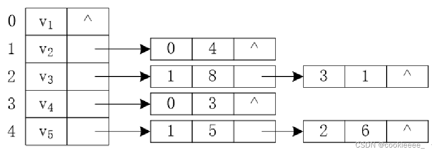 | 数据域(vertex) 存储顶点的信息 | 指针域(firstEdge) 用于指向链表中与vi邻接的第一个节点 |