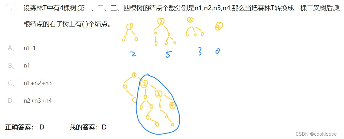 D、初始森林中共有n棵二叉树,进行n-1次合并后才能剩下一棵最终的哈夫曼树
