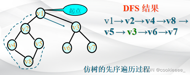 (2)选择一个与顶点v相邻且没被访问过的顶点w为初始顶点,再从w出发进行深度优先搜索,直到图中与当前顶点v邻接的所有顶点都被访问过为止。