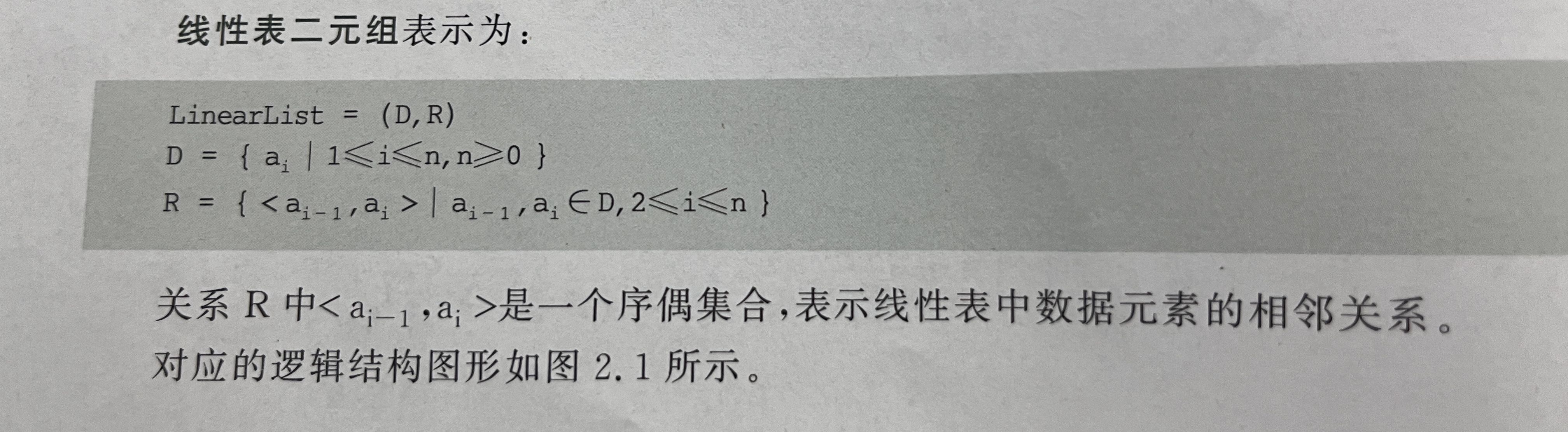 逻辑结构:数据元素之间的逻辑关系,一个逻辑结构包括数据元素和关系两个要素,可用二元组描述 G=(D,R),G 表示数据逻辑结构的名称,D表示数据元素的有限集合,R表示D上所有元素之间的关系的有限集合