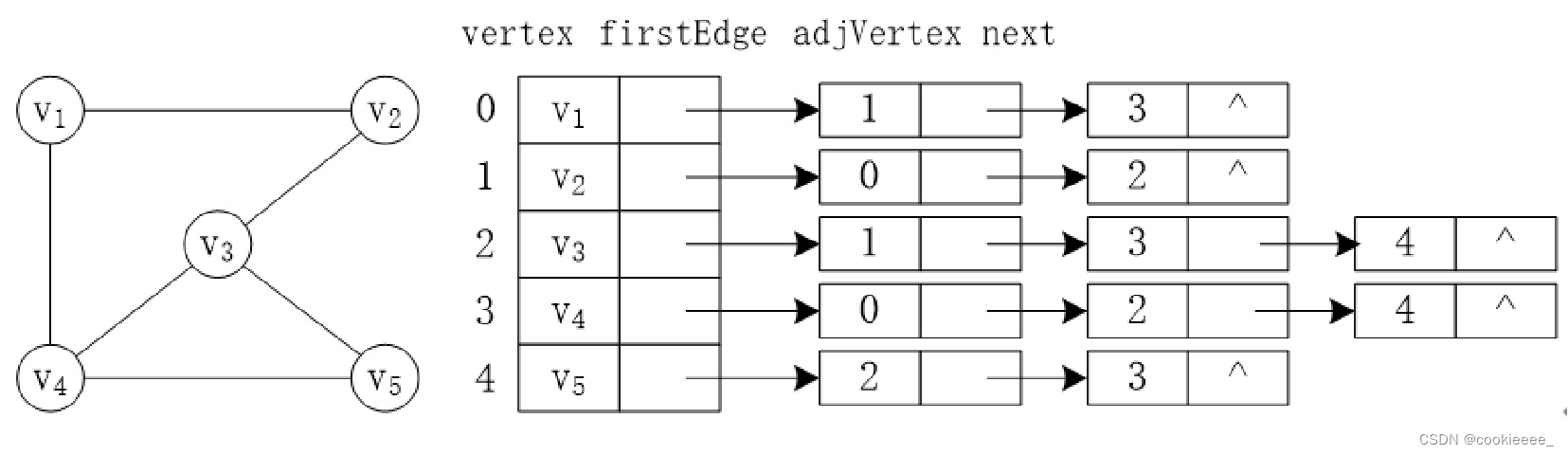 | 邻接点数据域(adjVertex) 存储的是该邻接点的数组编号 | 指针域(firstEdge) 用于指向vi的下一个邻接点 |