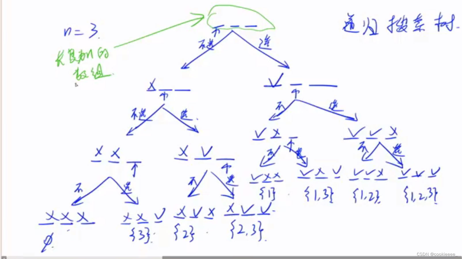 递归、dfs,最重要的是顺序,从1到n考虑每个数选不选--递归搜索树