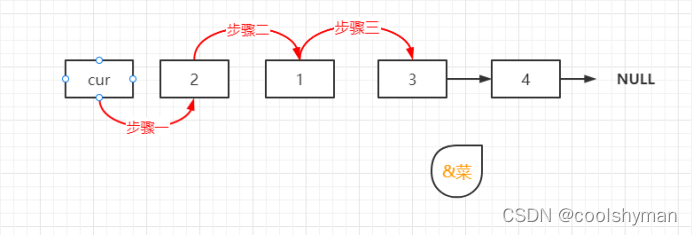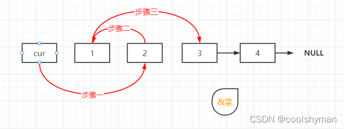 初始时,cur指向虚拟头结点,然后进行如下三步: