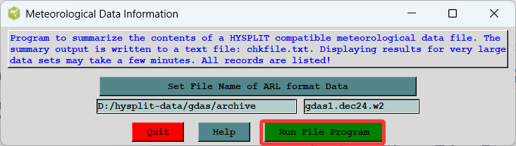 使用Check File功能,选择目标文件,点击“Run File Programe,计算结果路径位于:C:\hysplit\working\chkfile.txt