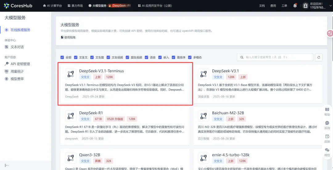 DeepSeek-V3.1-Terminus 新版模型已上线基石智算Coreshub,用户可立即在线体验或通过调用API使用。