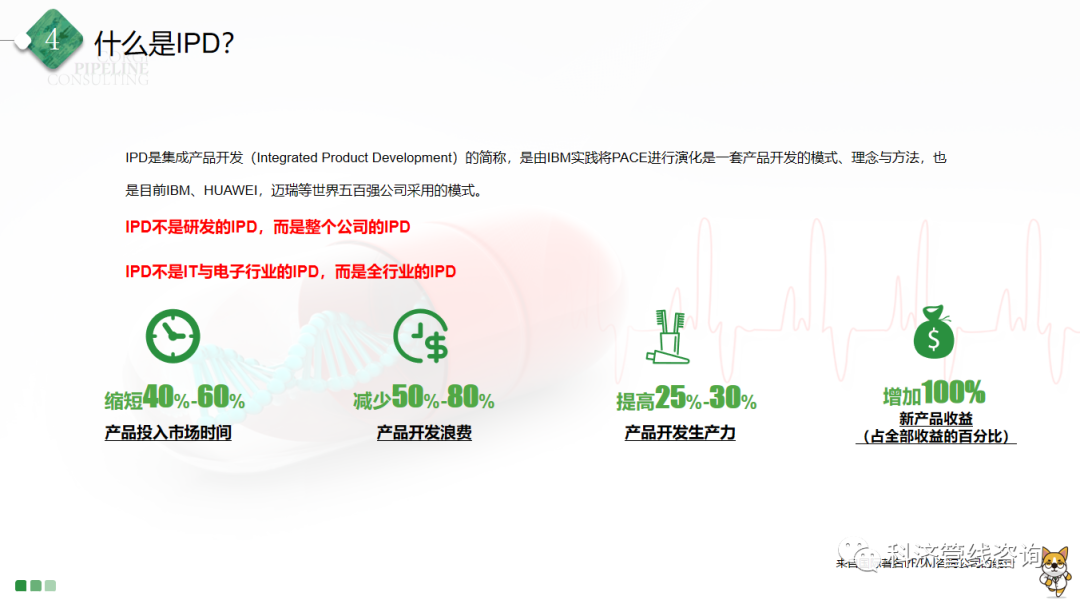 通过集成开发与研发管理(IPD) 实现缩短研发周期40%~60%、降低研发成本 50%~80%、提高研发投入产出比23%~30%,加快研发对市场的响应速度。在制药行业IPD也能节省30%的新药上市时间。