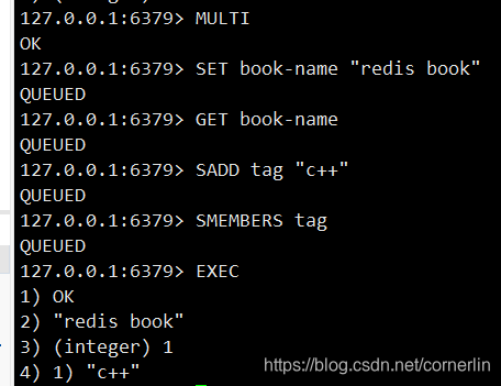 如 先以 MULTI 开始一个事务, 然后将多个命令入队到事务中, 最后由 EXEC 命令触发事务, 一并执行事务中的所有命令: