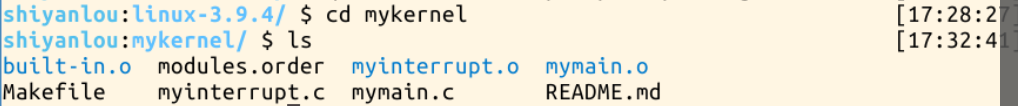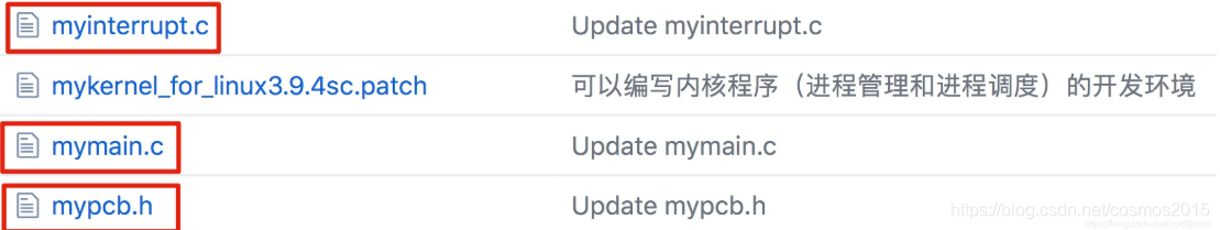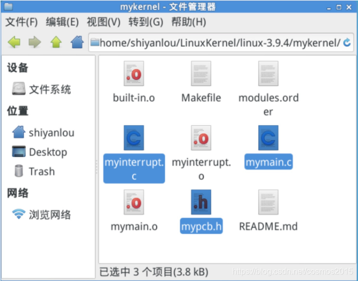 将这三个文件拷贝到LinuxKernel/linux-3.9.4下的mykernel中,覆盖掉之前的mymain.c及myinterrupt.c并增加新文件mypcb.h
