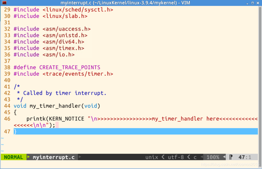 在myinterrupt.c文件中,有一个时钟中断处理会调用的函数:my_timer_handler,这个函数的功能是打印输出字符串:>>>>>>>>my_timer_handler here<<<<<<<<<<<<<。