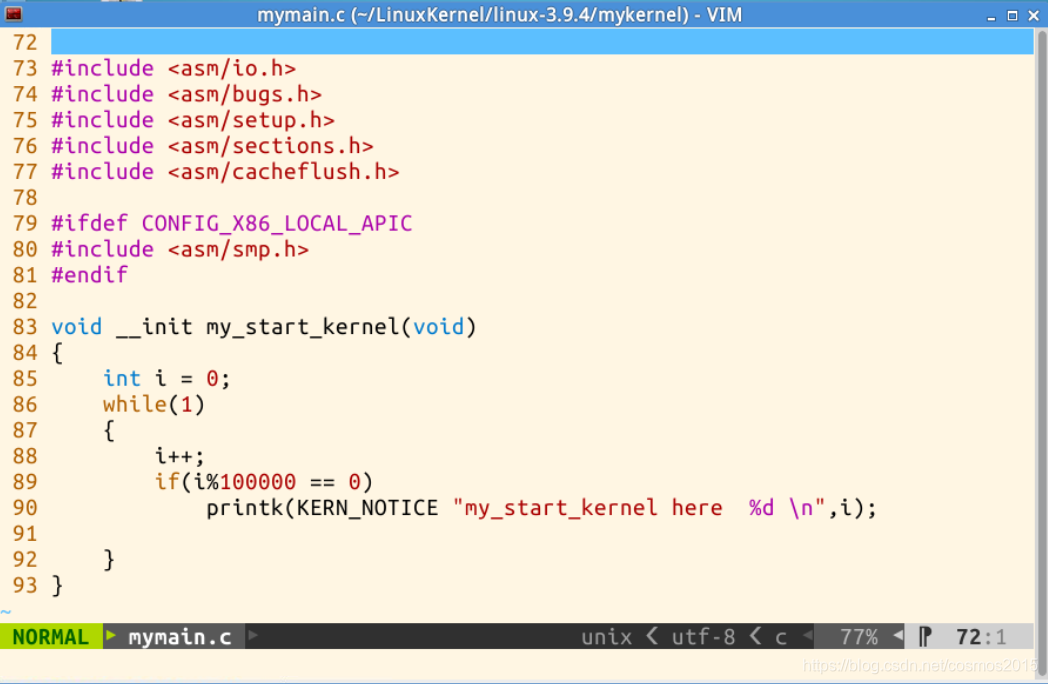 在mymain.c文件中有一个my_start_kernel函数,在其中的while循环中循环打印输出字符串my_start_kernel here。