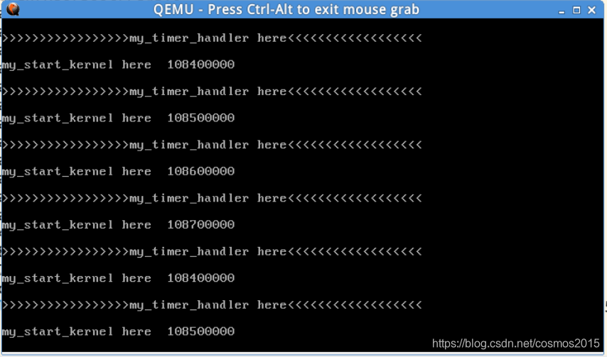可以看到一个简单的kernel已经运行起来了,窗口持续打印输出字符串:>>>>>my_timer_handler here <<<<< 和 my_start_kernel here