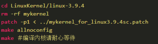 patch -p1 < ../mykernel_for_linux3.9.4sc.patch //一定要打补丁