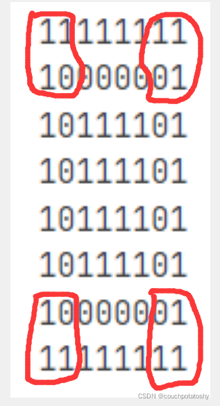 小明现在重点关注二维码图像中的特殊方阵,想定位仅有的三个特殊方阵。为了简化问题,你可以将二维码视为n∗m的 01 方阵,将用于标定的特殊方阵视为 8×8 的方阵,其形态如下:
