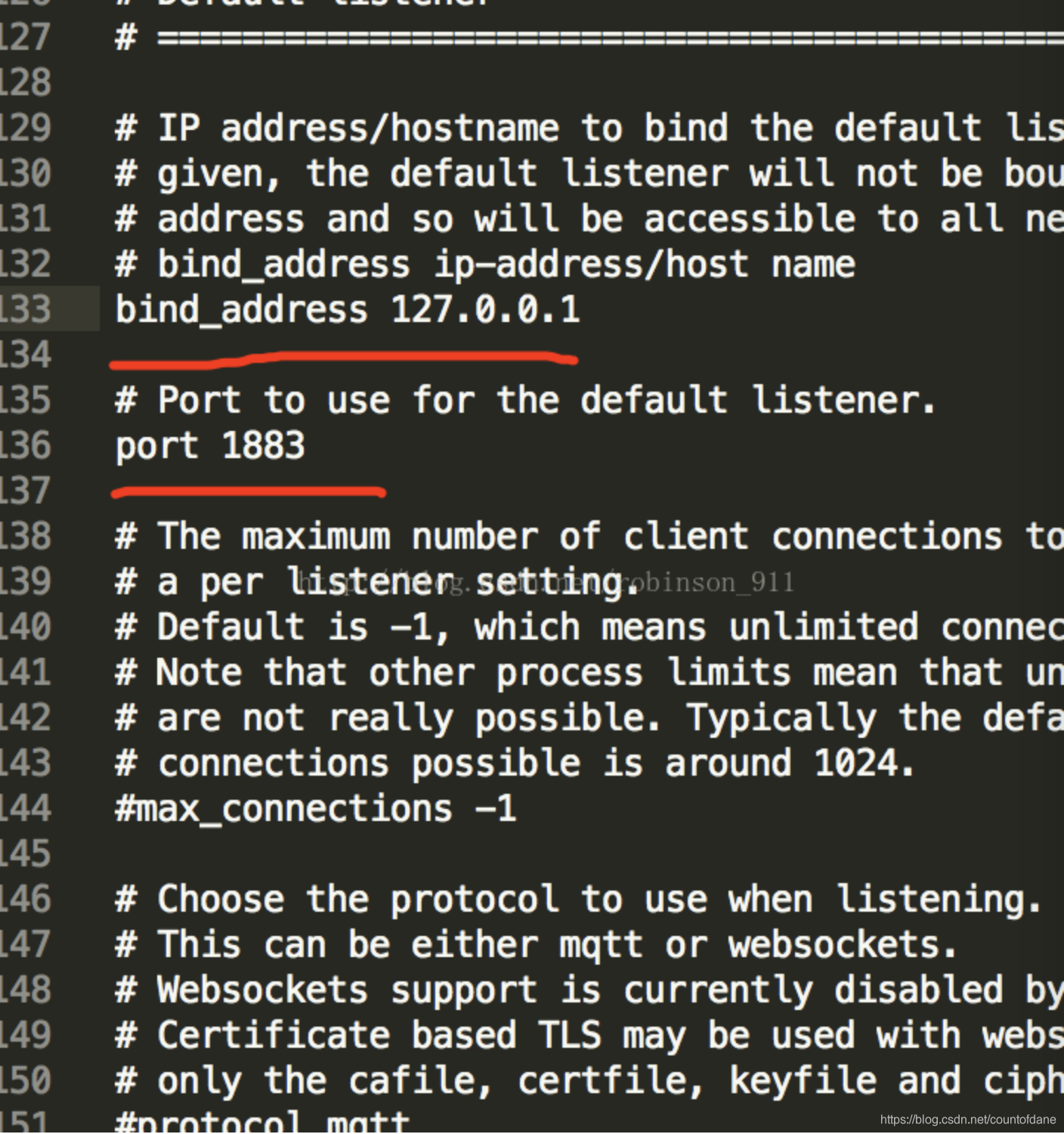 打开mosquitto.conf文件按照下面的截图来配置你自己的IP和端口号
