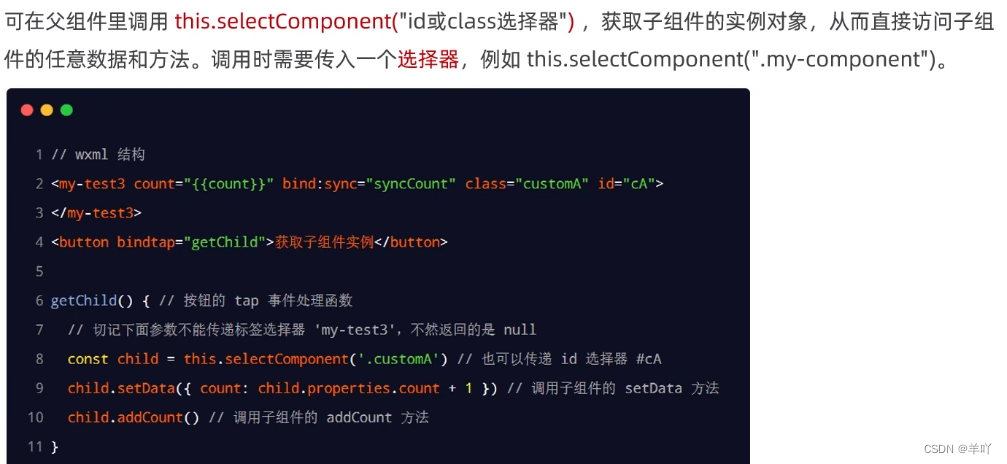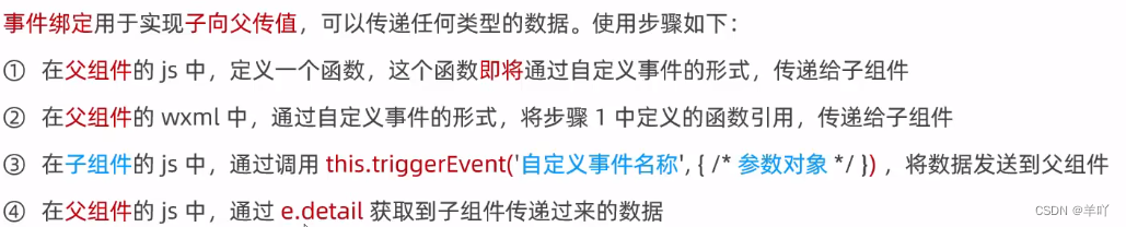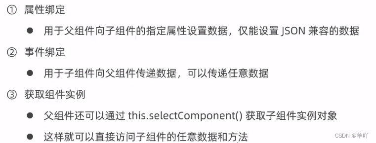 博客介绍了微信小程序的相关操作,包括属性绑定,涉及父组件和子组件;事件绑定,包含定义自定义事件、绑定事件、触发事件及获取子组件传递数据的步骤;还提及了获取组件实例的内容。