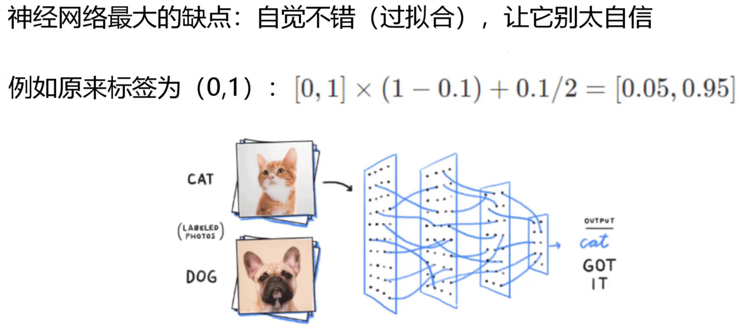 - 作用背景:神经网络易出现过拟合,标签平滑通过降低模型对标签的 “过度自信” 来缓解这一问题。