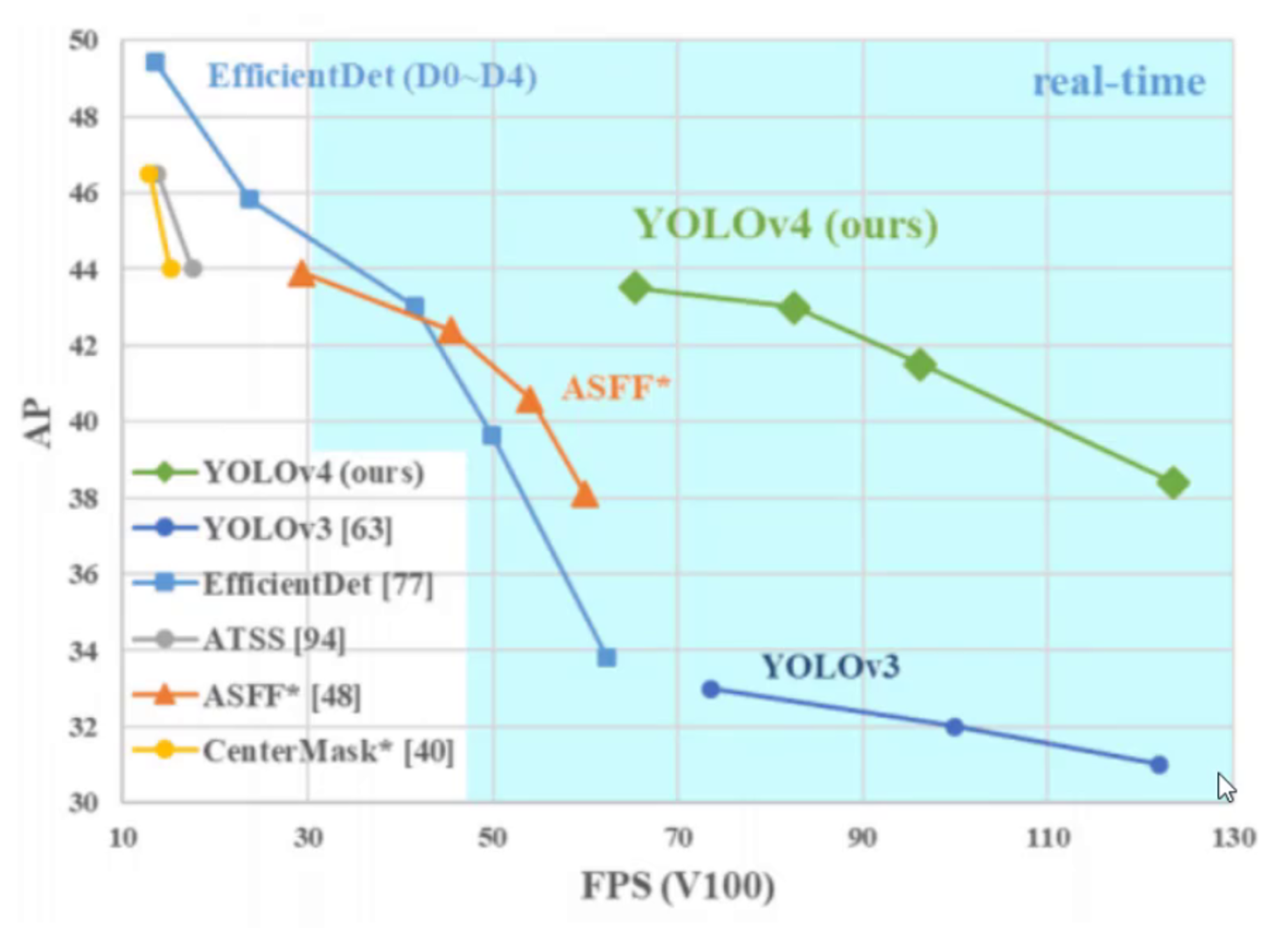 yolo的原作者由于军事应用和对他人个人隐私风险而退出了yolo系列的研究,但是yolo因为目标检测能力强一直别其他人延续以及研究,yolov4加了创新以及吸收了目前主流的框架优点,下面的图展示yolov4目标检测能力明显领先与其他目标检测算法,下面我们看看yolov4的创新点。