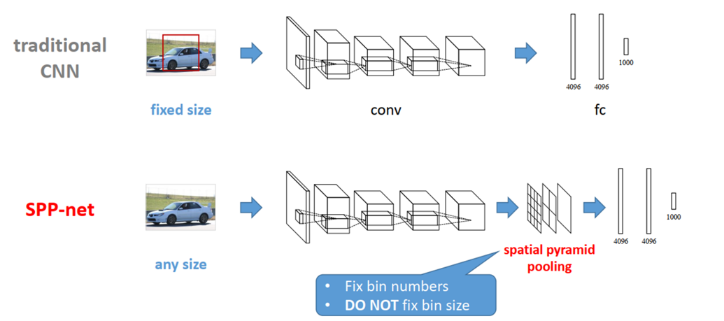 - 图示解读:上方为传统 CNN(需固定输入尺寸),下方为 SPP-Net(支持任意输入尺寸,通过空间金字塔池化输出固定特征),直观展现了两者在输入适应性上的差异。