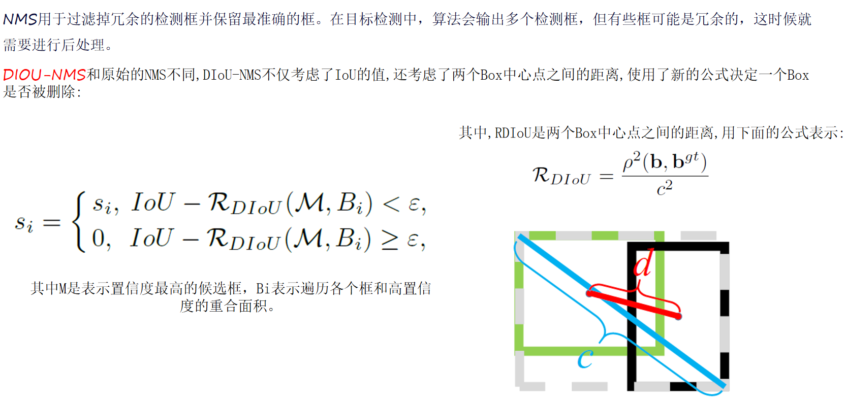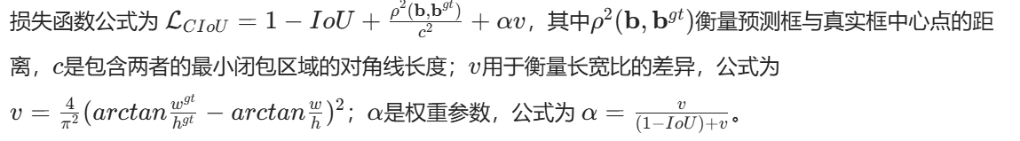 - 核心改进:在目标检测的边界框回归任务中,CIOU 损失同时考虑了重叠面积(IoU)、中心点距离、长宽比三个几何因素,相比 YOLOv3 的 IoU 损失更全面。