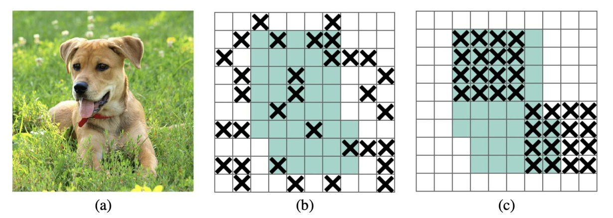 - 图 (a) 为原始输入图像(小狗);图 (b) 可理解为 Dropout 的屏蔽方式(随机分散屏蔽);图 (c) 为 DropBlock 的屏蔽方式(连续区域屏蔽),直观展现了两者在特征屏蔽逻辑上的差异。