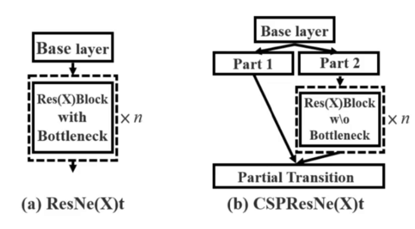 - 图示解读:图 (a) 为传统 ResNe (X) t 结构,图 (b) 为 CSPResNe (X) t 结构,直观展现了 CSP-Net 通过拆分 - 融合策略对传统残差网络的改进,体现其在轻量化与性能保持上的优势。