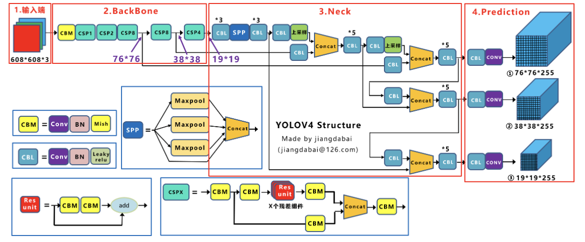 yolov4的整体网络结构,分为输入端、Backbone(骨干网络)、Neck(特征融合层)、Prediction(预测层) 四个模块,是目标检测 “特征提取 - 融合 - 预测” 流程的完整实现。