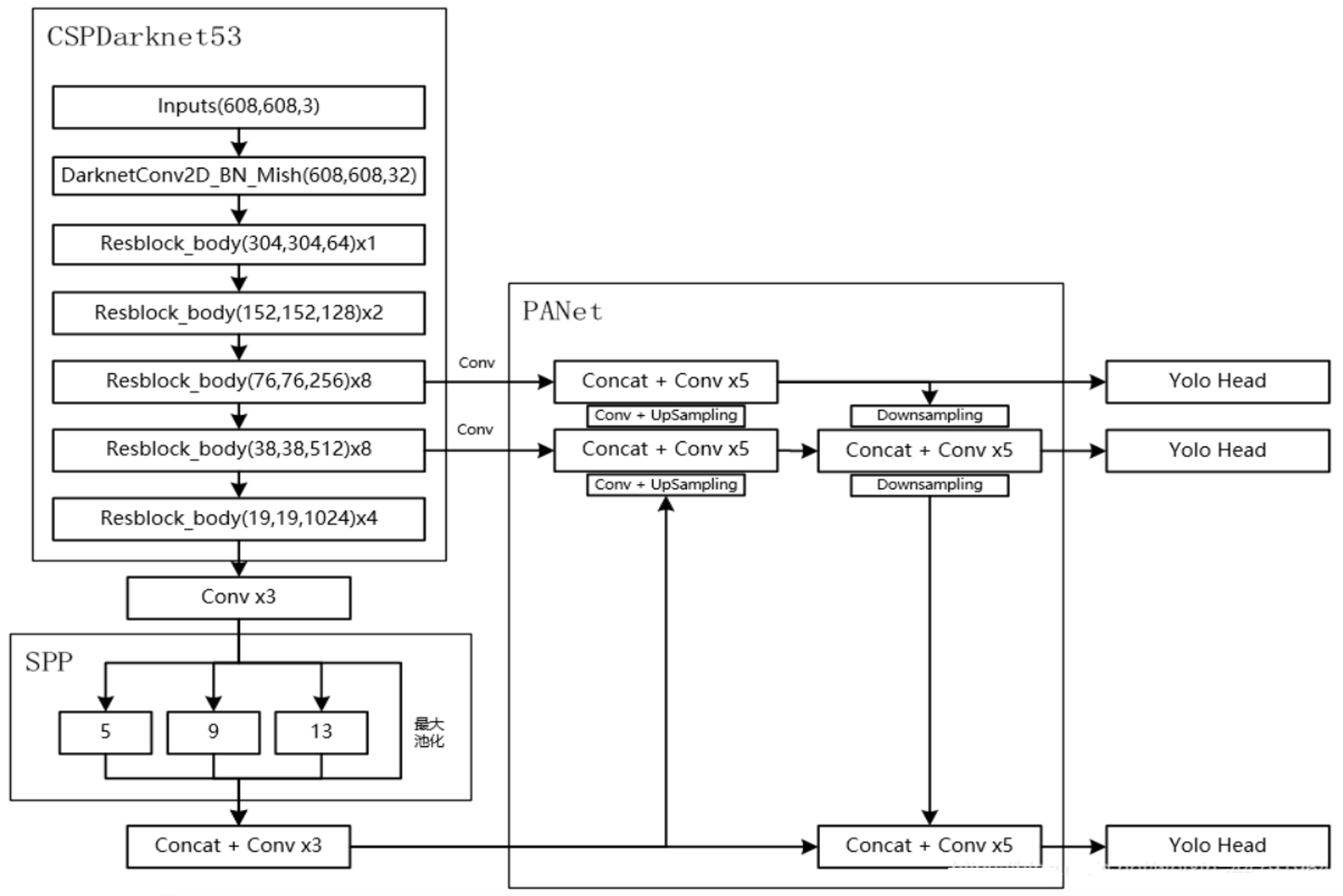 - Backbone:采用 CSPDarknet53,由多个 CSPX 模块(含残差组件)和 SPP(空间金字塔池化)构成,负责提取不同尺度的特征(输出 76*76、38*38、19*19 三种尺度的特征图)。其中 CBM 模块(Conv+BN+Mish 激活)和 CBL 模块(Conv+BN+Leaky ReLU 激活)是基础组件,Mish 激活函数相比 ReLU 能保留更多梯度信息,提升训练稳定性。