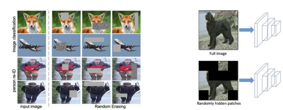 - Random Erase与Hide and Seek:Random Erase用随机值或训练集的平均像素值替换图像的区域,Hide and Seek:根据概率设置随机隐藏一些补丁
