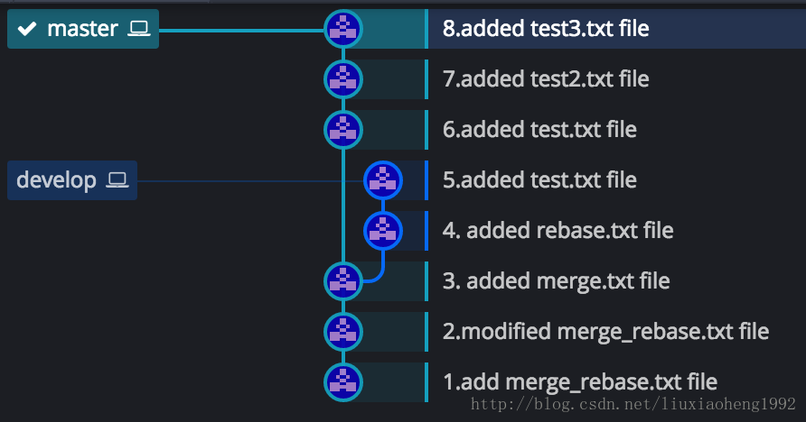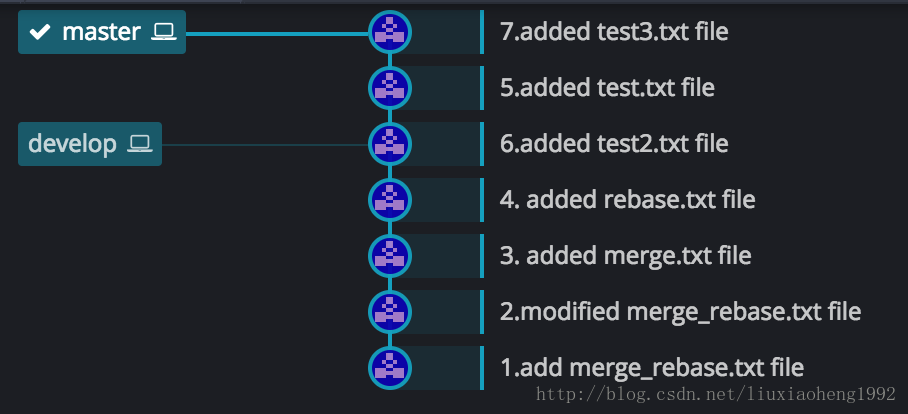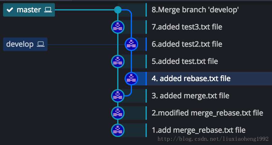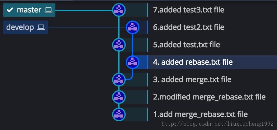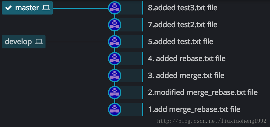 假设初始状态也是图一所显示的。两个分支一个master,一个develop,此时HEAD在(6.added hello.txt file)处,现在执行git rebase develop,结果如下图三所示。