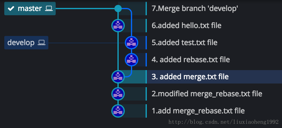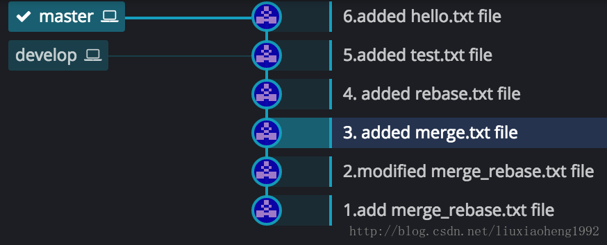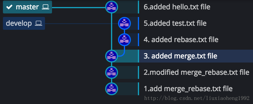 假设我们有如下图一所示仓库,该仓库有master和develop两个分支,且develop是在(3.added merge.txt file)commit处从master拉出来的分支。