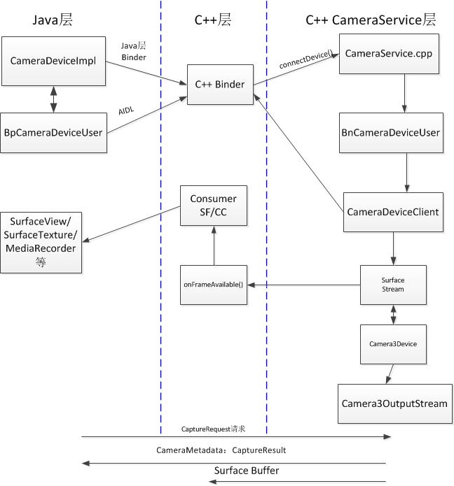 由图可知,Java层要想与C++层的CameraService层进行通信,都是通过Java层的IPC Binder进制进行的,主要包括ICameraService.aidl以及ICameraDeviceUser.aidl两个接口来实现,其会在Java层维护一个CameraDeviceImpl即Camera设备的代理,而CameraService以及CameraDeviceImpl的初始化会在此文的第二,第三节进行分析。而Java层对Camera的具体操作的操作流程大致为,Java层通过Device代理发送一个CaptureRequest,而C++层进行相应的处理,再调用相应的回调来通知Java相应的处理结果,并将相应的Capture数据保存在Surface Buffer里,这样Java层在回调函数中可以对数据进行相应的处理。而对于具体操作流程的分析,请参考文章开始时的Camera2相关文章的连接。
