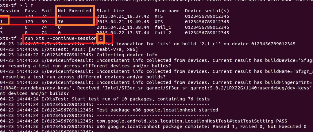 5. 在第一轮之后如果有not executed状态的case,可以通过”run xts --continue-session session_ID” 继续run not executed的case,其中的session_ID可以通过”l r”查看,如图4所示。