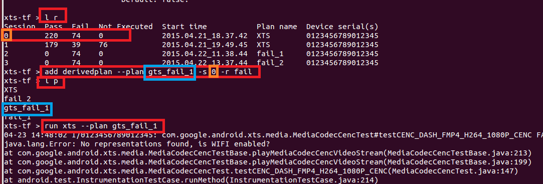 6. 一般保证测试中的fail项run 三遍,所以当第一轮跑完之后可以通过 ” add derivedplan --plan <plan_name> -s <session> -r fail ” 来专门创建session中fail项的plan,创建之后可以通过 ”l p”查看是否成功创建plan_name,确保创建成功 之后通过 ”run xts --plan plan_name”来rerun fail项了,如图5所示。