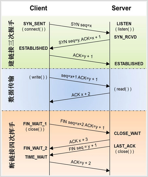 Ⅲ丶第三次握手:客户端收到服务器的SYN+ACK报文段。然后将Acknowledgment Number设置为y+1,向服务器发送ACK报文段,这个报文段发送完毕以后,客户端和服务器端都进入ESTABLISHED状态,完成TCP三次握手。