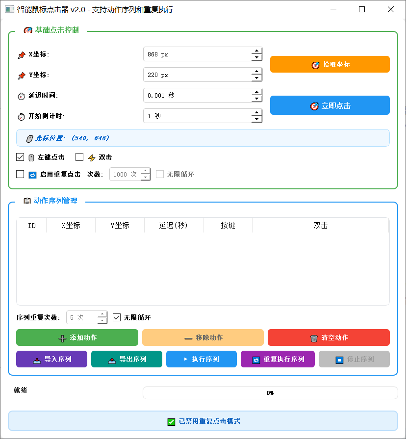最近使用QT结合AI整了一款Windows端的鼠标点击器,可以帮我我们解放双手,按照既定的xy坐标去处理点击动作!