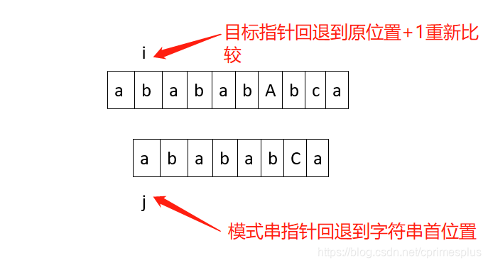 不难发现,当前面的六个元素全都匹配成功、胜利就在眼前的时候,不幸的事情发生了——i 指针挪到 a 的位置, j 指针挪到 c 的位置,此时遇到了不匹配的情况。怎么办?按照 BF算法的思想,j 指针只有回到最初的起点,i 指针也好不到哪去,只能从最初起点的下一个位置再进行比较。