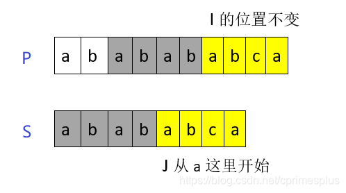 换言之,S 串标成灰色的前四个字符,恰好是 P 串 标灰部分的后四个字符,而这四个字符因为已经比较过的缘故,无需再进行比较。此时 j 仅仅需要回退到 P[4],而 i 则保留在原来的位置,与 P[4] 之后的元素接着进行比较。