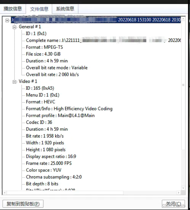 以下为此文件信息截图,可以看到时长是4小时59分,仅仅有一个视频流,并无音频流,视频流编码为HEVC,反向推断此安防监控的视频编码为265。这个文件在播放查看时解析全部正常,这意味着完整性没有问题,数据区并没有被覆盖。