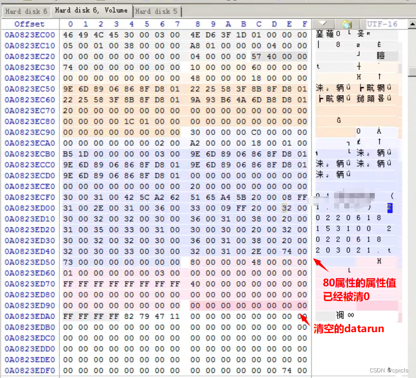 可以看到上图中文件名中包含了摄像头名称、起始时间和结束时间,这个是典型的安防监控合成文件的命名方式。现在的问题是为什么文件长度为0字节?这个答案和NTFS文件系统对删除文件的操作有关,如果一个文件长度大于4G,那么删除后除了做MFT元文件删除标识外,还要额外对此元文件的80属性进行清0操作,清0对象为: