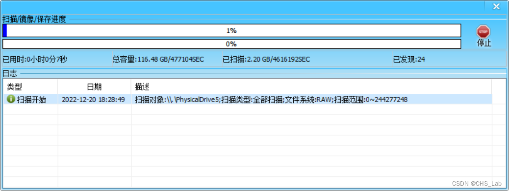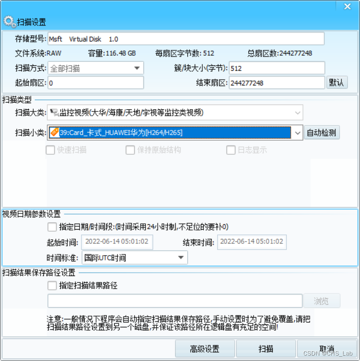 了解了文件结构,通过分析得到了碎片的重组方法,直接添加到CHS零壹视频恢复程序中,所以处理方法比较简单。运行CHS零壹视频恢复程序监控版(专业版/高级版),点击扫描->选择39:Card_卡式_HUAWEI华为[H264/H265]->扫描即可