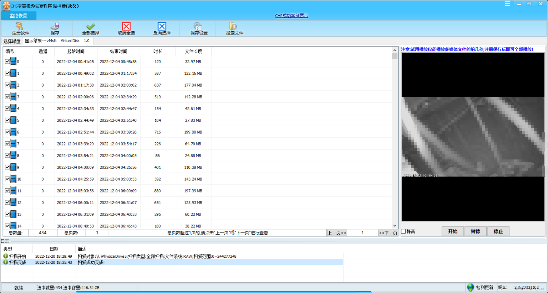 查看结果如下图,可以看到总共发现了434个文件,大小约116G。同时程序列出来了通道、起始和结束时间以及时长和文件长度,这一步可以通过搜索文件进行快速定位,至此恢复完成。成功找到了客户所需的文件,且可以正常播放。(注:右侧的试用播放进行了打码操作)