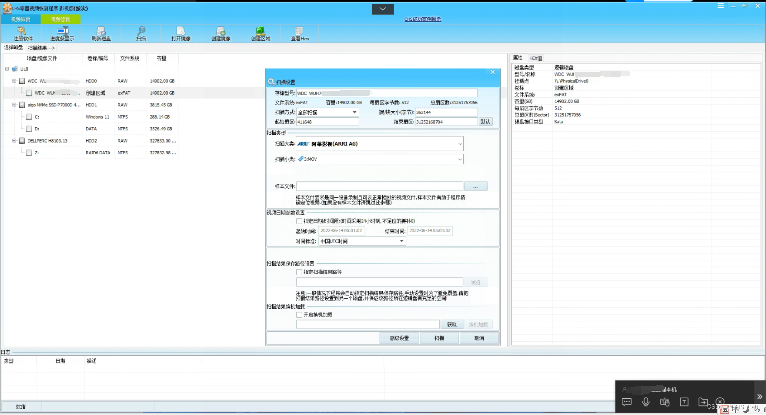 STEP1:运行CHS零壹视频恢复程序影视版选择16T存储设备,点击右键扫描大类“阿莱影视(ARRI AG)”,扫描小类选择”MOV”,点击 “扫描”即可。