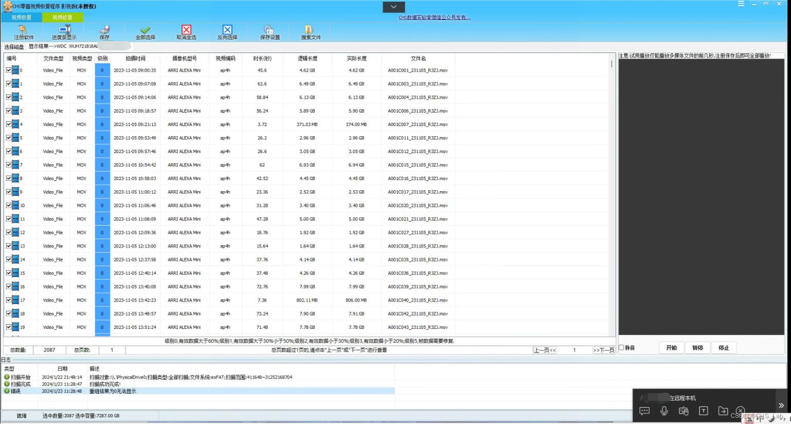 STEP3:查看数据,经过扫描发现了大约7T多的有效数据,CHS零壹视频恢复程序影视版扫描完成后会列出拍摄时间、摄像机型号、视频编码及文件名等参数,经过客户对比文件名成功找到了变为0字节的素材,至此数据恢复工作完成。
