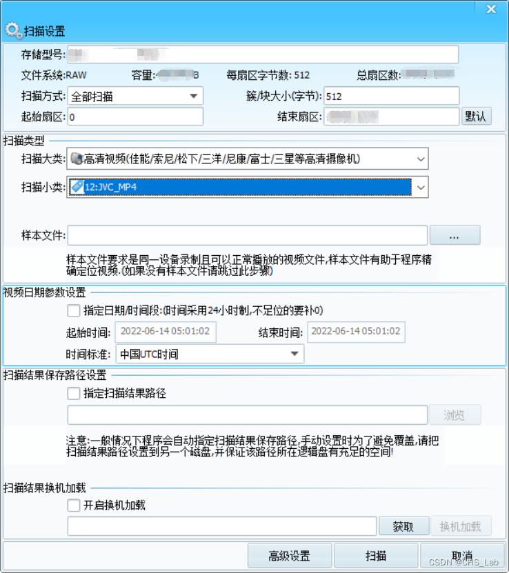 STEP1:由于文件系统已经彻底损坏,所以直接选择物理盘就可以(本例中直接打开镜像文件),扫描大类选择”高清视频“,扫描小类选择”JVC_MP4,然后点击确定。