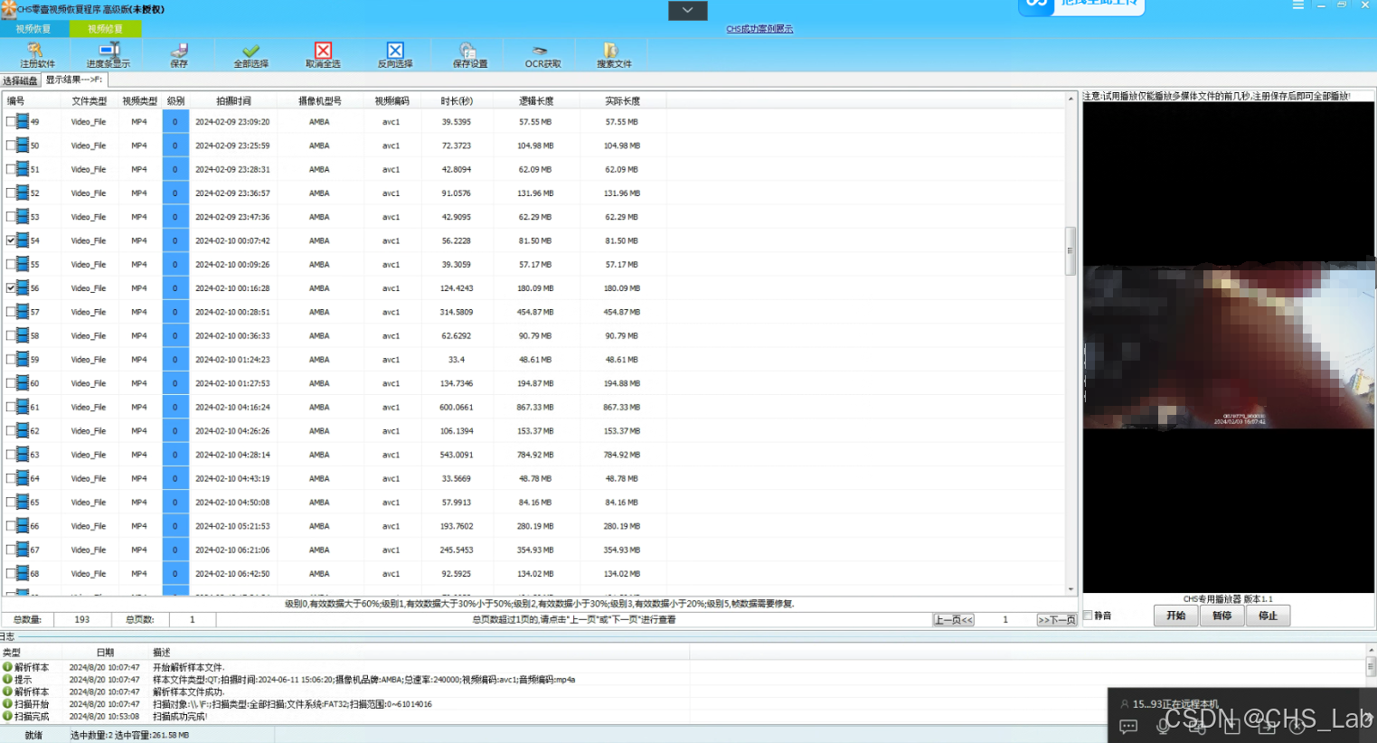 STEP3: 查看结果,可以看到程序共发现193条视频文件,同时对“级别、拍摄时间、摄像机型号、视频编码、时长”等参数做了罗列,方便查找。经过客户查看正是其所需要的数据,至次恢复工作完成。