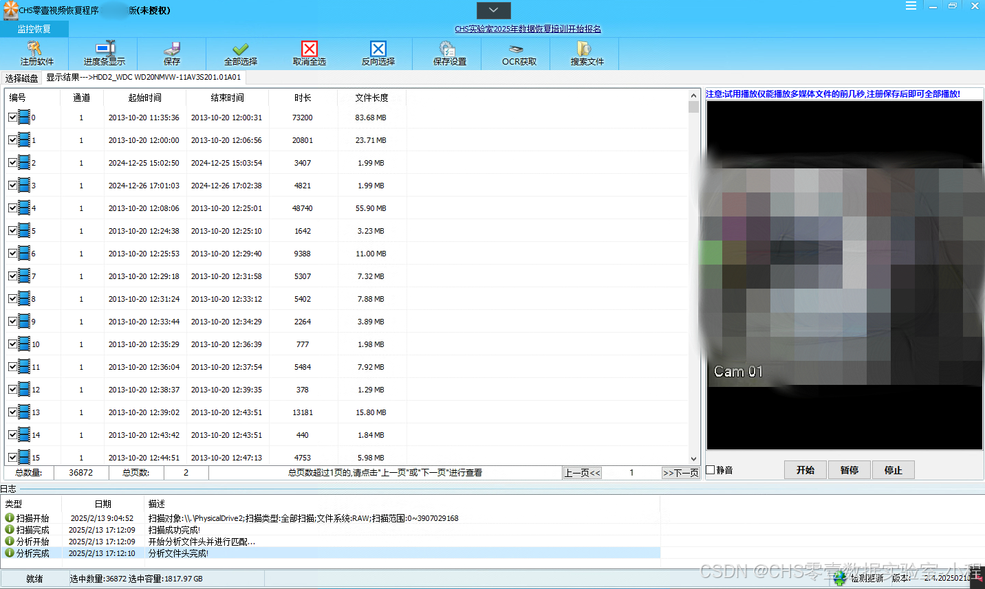 STEP3:扫描完成后直接查看数据,可以看到程序已经列出了通道、起始时间、结束时间、时长、文件长度等参数,通过此参数可以查找需要的数据。经过对比成功恢复了客户需要的数据,至此恢复完成!