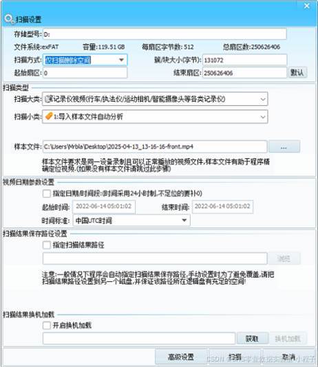 STEP1:选择要扫描的磁盘点击右键->扫描大类选择“记录仪“,扫描小类选择“样本文件”,添加样本文件后点击“扫描”即可。添加样本时也要注意,像特斯拉(Tesla)存在四路摄像头,添加样本时一定要添加你所需要的那一路生成的视频文件,本例中由于需要后置摄像头,那么我们要添加的就是后置摄像头中的视频文件,下边是如何分辨的方法。