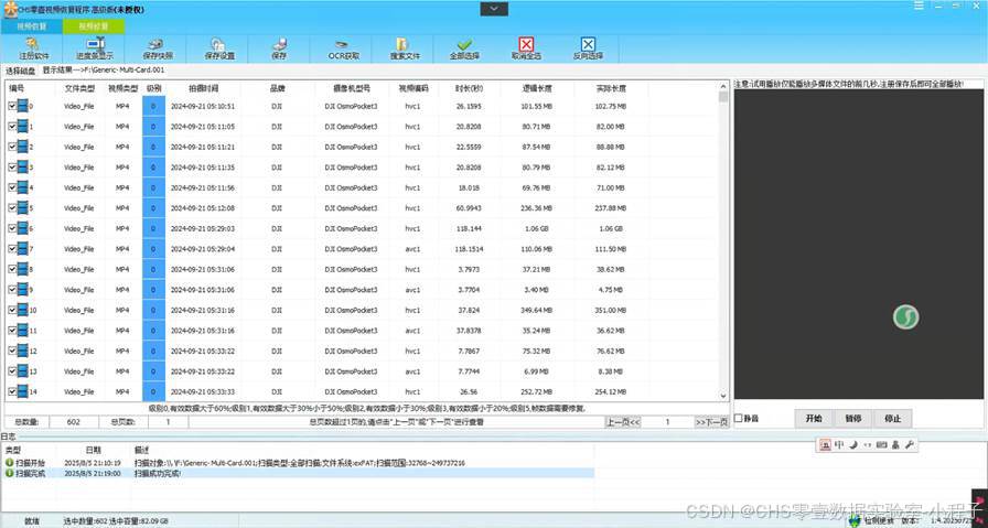 STEP3:扫描完成后直接查看数据,可以看到高级版已经列出了视频类型、级别、拍摄时间、摄像机型号、视频编码、时长、长度等参数,这些参数为查找数据提供了便利。可以看到程序成功找到了大约602条视频素材容量82GB左右,经过和客户对比所有素材成功恢复,数据恢复工作完成!